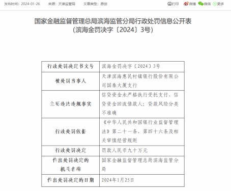 中国网财经1月29日讯日前,国家金融监督管理总局滨海监管分局行政处罚信息公开表显示,在线股票配资天津滨海惠民村镇银行国泰大厦支行因信贷资金未严格执行受托支付、信贷资金回流借款人;贷款风险分类不准确,被罚90万元;作出处罚决定的日期为2024年1月25日。