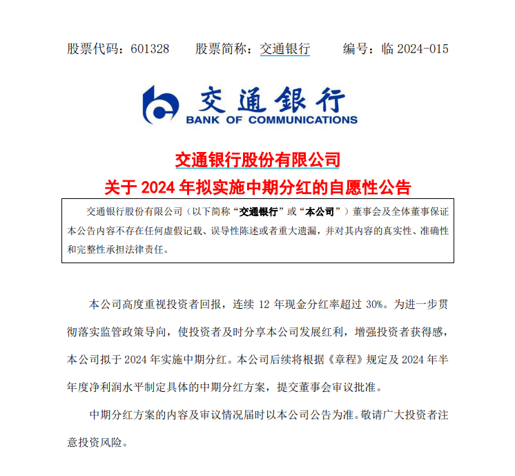 4月29日晚间,交通银行也发布了关于2024年拟实施中期分红的自愿性公告。