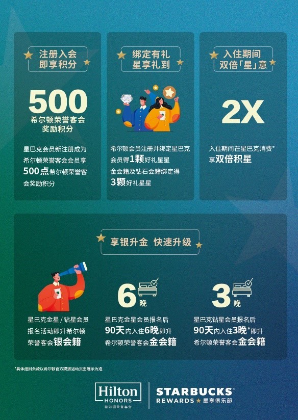 成为联合会员后,参与星巴克双倍积星活动,入住希尔顿期间,所有星巴克门店及线上消费都将获得双倍积星奖励。目前,双方合作范围仅限于中国大陆地区的门店。